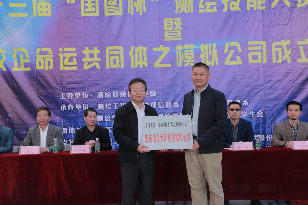 接着,何军拥、黎明虹为武汉天宝耐特科技有限公司、上海华测导航技术股份有限公司广东分公司、广州天派空间科技有限公司、广州南方测绘科技股份有限公司广州分公司、广州一飞航空科技有限公司、广州宏拓测量仪器有限公司授予广东工贸-测绘地理信息校企命运共同体之模拟公司牌匾。