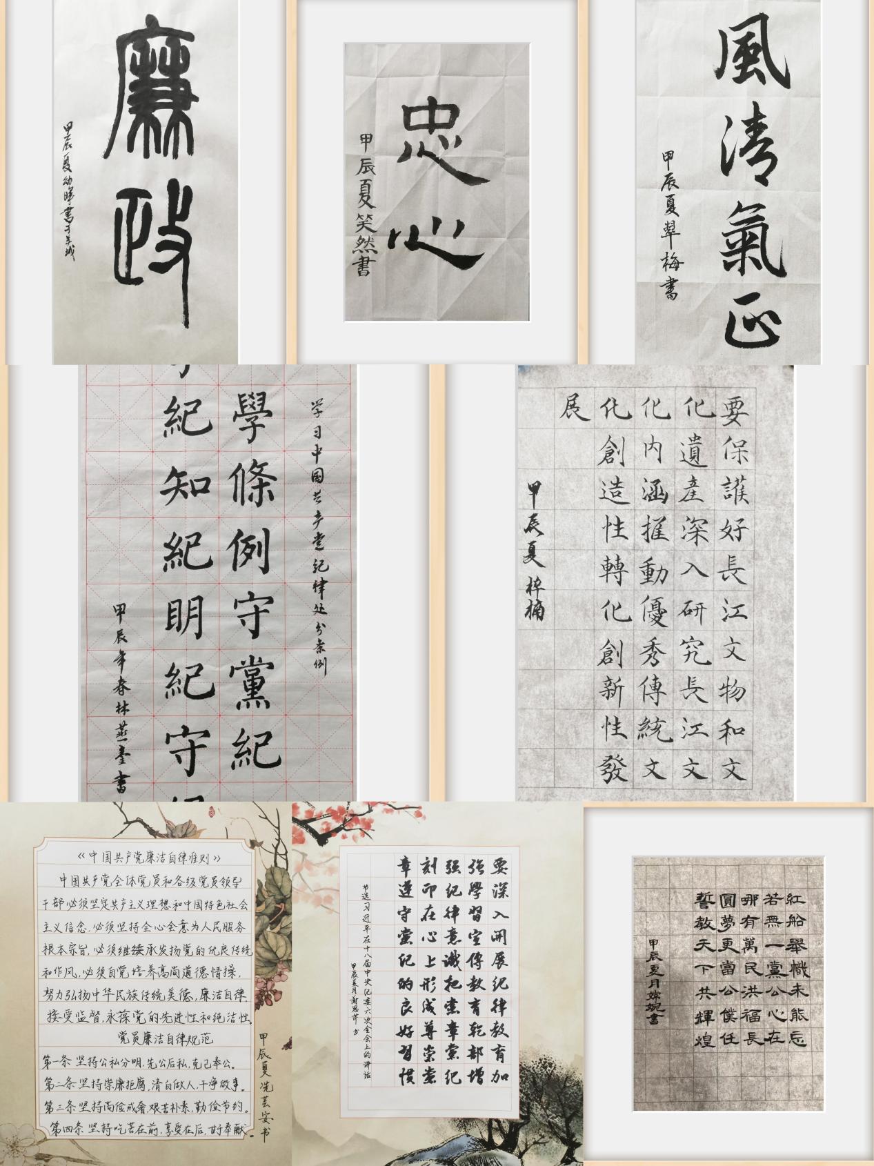 会议第二项内容是组织“手书党纪 心正党风”现场书法比赛。党员同志纷纷围绕党纪学习教育主题,我手写我心,现场创作书法作品,表达学习心得与体会。书法作品内容丰富,形式多样化,软笔硬笔兼具,字体各具特色,楷书、行书、篆书、隶书皆有,充分展示了艺教学院教师党员的政治觉悟与书艺风采!