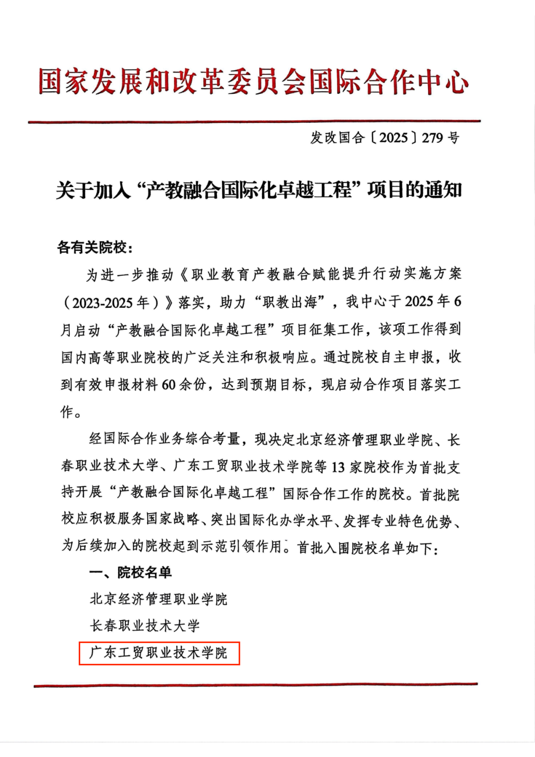 近日,新葡的京集团8814vip成功入选国家发展和改革委员会国际合作中心“产教融合国际化卓越工程”项目首批支持院校名单。