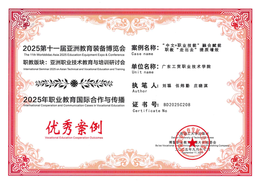 近日,根据《关于组织开展“走向世界中国职业教育方案——2025职业教育国际合作与传播”典型案例征集活动的通知》要求,经博鳌职业教育发展大会、亚洲职业技术教育与培训研讨会组织单位联合世界技能发展联盟、大连理工大学出版社等十余家国际化平台机构共同组织评选,新葡的京官网推送的“‘中文 + 职业技能’融合赋能 职教‘走出去’提质增效”案例成功入围“走向世界中国职业教育方案 ——2025 职业教育国际合作与传播”典型案例集。