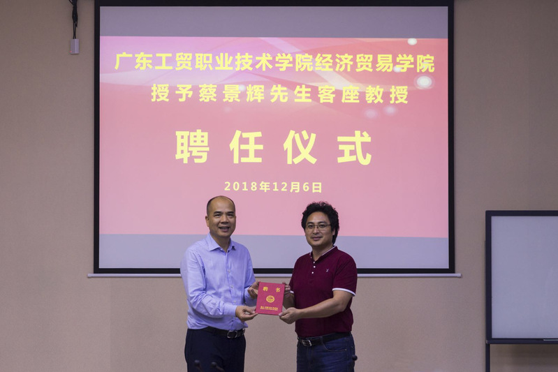 嘉谦公司董事长蔡景辉先生创业经历丰富,企业也因不断创新始终立于行业翘楚,基于对蔡先生的剑胆卓识以及对其创业经历的欣赏,我院特聘请蔡先生为我院客座教授,为其颁发客座教授聘书,并请蔡先生到学院为学生进行创新创业讲座和培训。