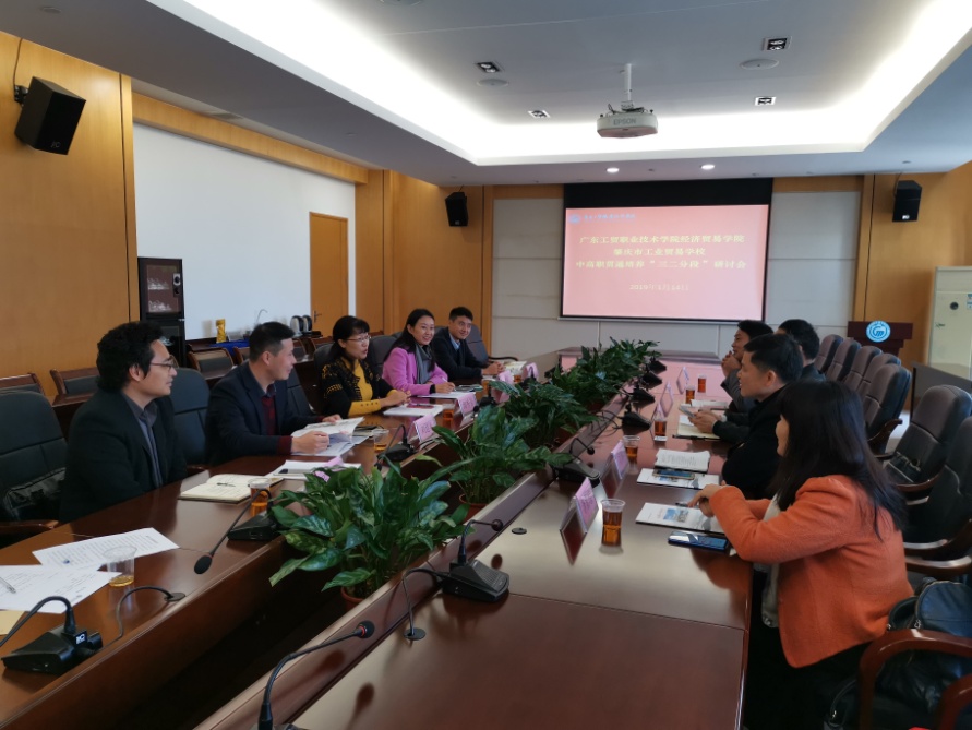 1月14日上午,肇庆市工业贸易学校副校长罗红金、教务科科长冯华、招生就业办主任张辉、基础部部长李素琼一行一行4人莅临新葡的京官网开展中高职贯通培养“三二分段”研讨会。新葡的京官网学生处处长刘建军,经济贸易学院党总支副书记书记王坤明(主持工作),院长邱秀芳,党总支副书记龚云,副院长方洁热情接待。