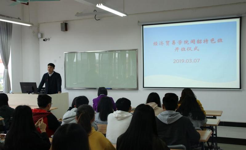 为了进一步打造经贸学院品牌,经贸学院领导班子商议,成立“闻韶”特色班,为培养德智体美劳全方面发展的学生,让学生们通过学习,提升良好的气质与修养,塑造经贸学子卓尔不凡的美好形象。在上学期,经贸学院开始组织学生报名,并逐个对学生进行了面试筛选,学院领导们一起商议课程的安排,拟定了任课老师。2019年3月7日下午两点,经贸学院“闻韶”特色班开班仪式正式在明德楼1-510拉开了序幕,出席会议的有经贸学院党总支龚云副书记、方洁副院长、李艇、邓彩云老师以及“闻韶”班的50名同学。