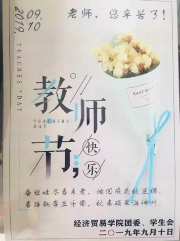 在这金秋送爽的丰收季节里,我们迎来了第三十五个教师节,经贸学院师生开展“庆祝新中国七十华诞,弘扬新时代尊师风尚”主题活动。来自60后、70后、80后、90后的老师们纷纷发表感言,来自00后的同学们,为辛勤工作的老师们送上精心制作的贺卡。
