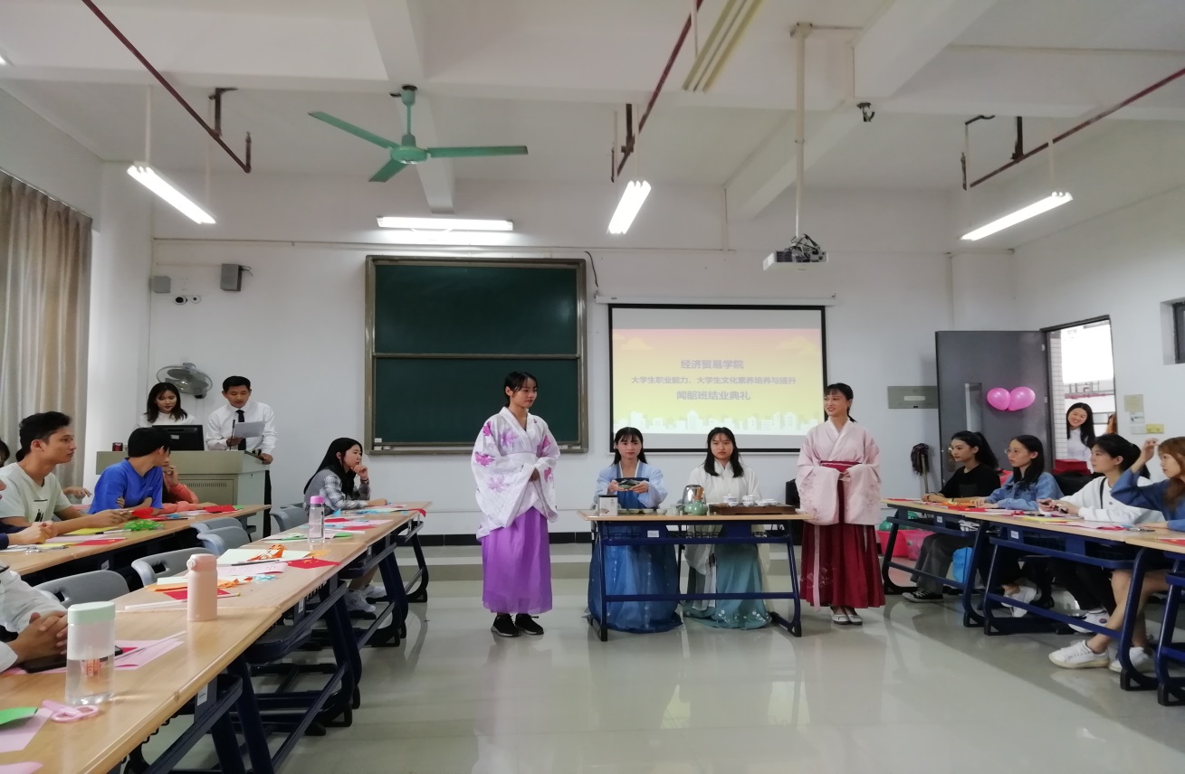 “闻韶班”在经贸学院党总支王坤明副书记、经贸学院邱秀芳院长的首倡下,在学院全体领导班子成员的亲切关怀下,在全体教师的大力支持下举办的一个“英才特色班”,它旨在扩大学生的视野、弘扬中国传统文化、丰富学生能力、发挥学生特长、提升学生职业能力与文化素养。结业典礼分为三个阶段。