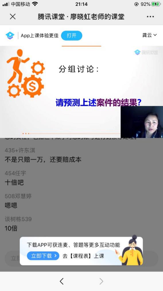 经贸学院微信群里也沸腾了,从早上8点到晚上10点,老师们都在不断讨论如何上好一堂满意的网络课。有的老师在发表感言和心得,有的老师在总结使用优慕课平台和直播课程的经验,有的老师在比较各大平台的优缺点,大家愉快地交流和学习,甚至为超预期的网课教学效果激动不已。更值得一提的是,两位身在武汉的男主播,心在广州、在课堂、在学生身上,完全没有疫情影响的阴霾情绪,一堂课下来轻轻松松圈粉无数。新入职的年轻老师们也不甘落后,不是去听课就是写总结谈体会,大有长江后浪拍前浪之势。