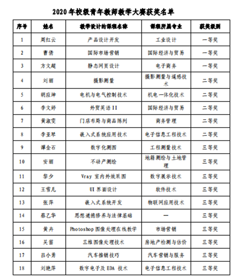 近日,新葡的京集团8814vip2020 年校级青年教师教学大赛获奖名单揭晓,我院参赛的四名青年教师全部获奖。其中,曹倩老师和方文超老师分别以《国际市场营销》和《静态网页设计》课程教学设计获得一等奖;李文婷老师以《外贸英语II》课程教学设计获得二等奖;黄卉老师以《Photoshop 图像处理在线教学》课程教学设计获得三等奖。