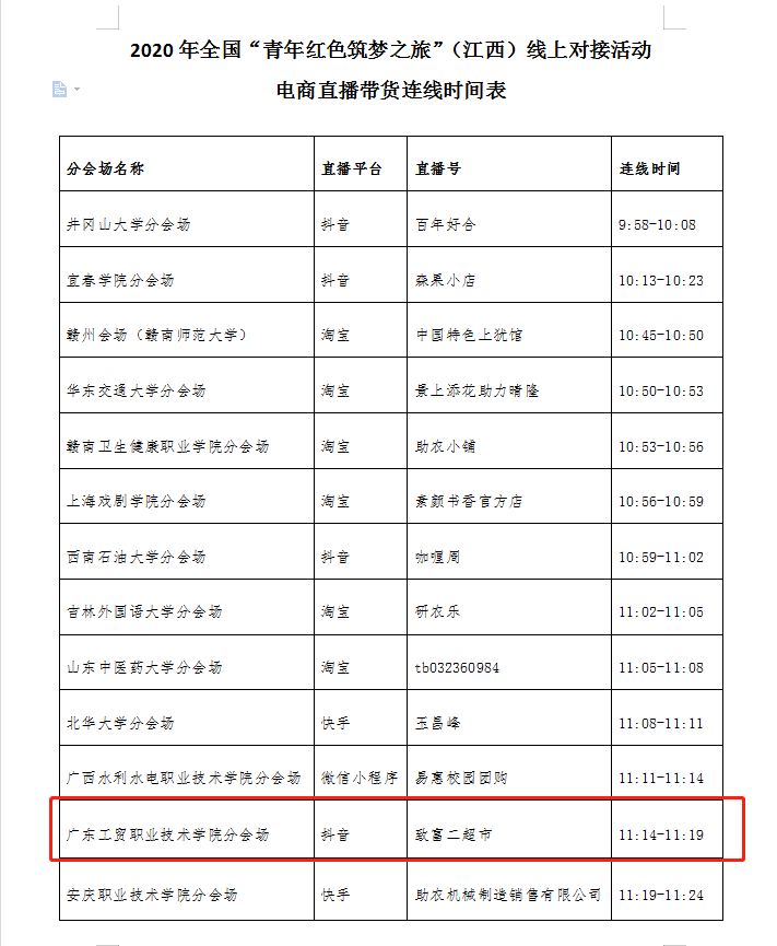 7月28日,第六届中国国际“互联网+”大学生创新创业大赛全国“青年红色筑梦之旅”江西线上对接活动成功举行。活动由教育部主办,江西省教育厅承办,南昌大学、井冈山大学、宜春学院、萍乡学院协办。新葡的京官网“致富二超市项目”作为广东省教育厅的十个代表项目之一参加了本次活动,同时,新葡的京官网被指定为本次活动中“红旅”扶贫产品电商直播连线广东省唯一分会场。