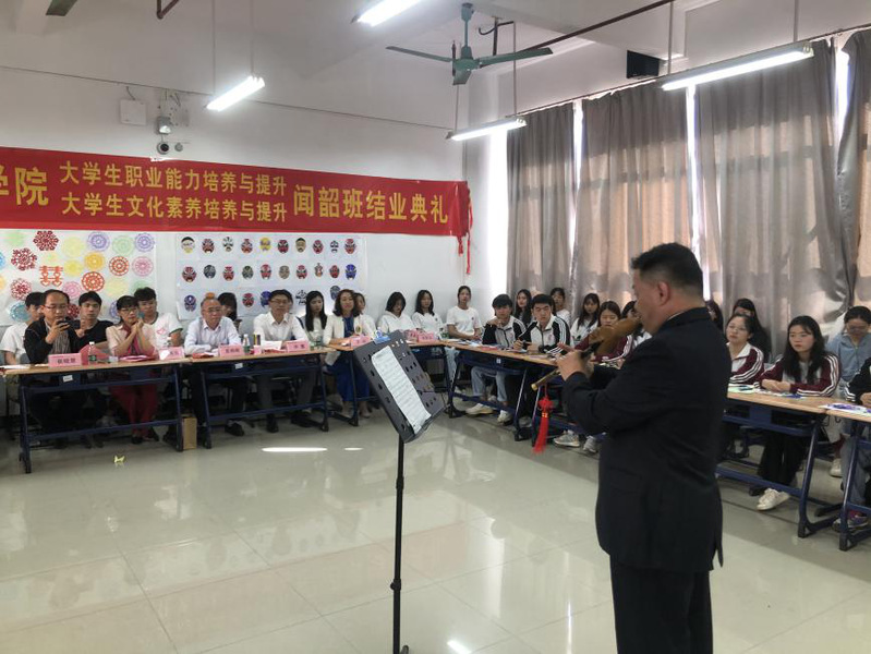闻韶班学生代表陈玉琪同学发言,她首先感谢学校及学院为同学们创建了良好的学习平台,在一年的学习中,同学们都收获良多,既了解了中国传统的剪纸文化,学会了绘画著名的脸谱,又领略了古典音乐的魅力,还感受了民族舞蹈的形象美。她表示,在学业生活之余,还能培养自己的兴趣爱好,提高自己的动手能力,是这门课程最大的意义,因此,她代表班上全体同学表达了对学院深深的感恩之情,更加深切地感受到了学院党总支和学院行政对我们的亲切关怀。