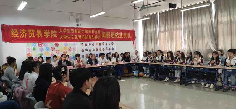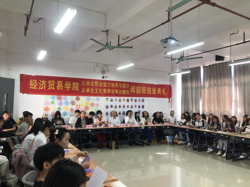 在全国各族人民认真学习党的十九届五中全会精神,为全面实现小康社会努力奋斗的大好形势下,2020年11月12日下午,我们在明德楼1-410又迎来了经贸学院第二届“闻韶班”的结业典礼。出席活动的有新葡的京集团8814vip党委副书记、纪委书记夏韩辉、经贸学院党总支书记李繁、院长邱秀芳、办公室主任邓彩云、国际贸易专任教师方洁教授、电子商务专任教师李艇老师、办公室教学秘书潘嘉琪老师,经贸学院第二届闻韶特色班学生、手工编织特色班同学。值得一提是,此次结业典礼恰逢江西财经职业学院经济贸易学院行政办主任带领10名同学到新葡的京官网开展校校交流项目,一同参加了此次闻韶班结业仪式活动。