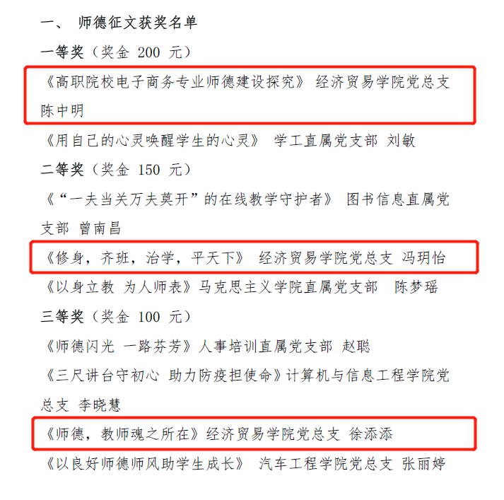 转眼间,2020年已经接近尾声,经贸学院的好消息可向来不会停下脚步。近日,根据《关于表彰2020年师德建设优秀征文和优秀微视频的决定(粤工贸院党宣〔2020〕14号》精神,在学校开展师德建设活动中,陈中明、冯玥怡、徐添添三位老师分别获得“淬炼师德师能,践行育人使命”主题征文的一、二、三等奖,章少重老师获得主题微视频三等奖。值得一提的是,因为组织有力,学院成为参赛作品最多,获奖数量最多的单位,学院也因此荣获优秀组织奖。