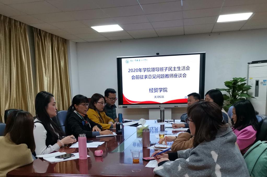 根据党章和党内有关规定以及学校《关于印发<中共新葡的京集团8814vip委员会关于认真开好2020年度党员领导干部民主生活会的实施方案>的通知》要求,为开好经贸学院2020年度民主生活会,汇聚基层力量,推动学院“十四五”时期开好局、起好步,1月7-8日,学院领导班子李繁、邱秀芳、龚云、蒋晶分别主持召开了民主生活会会前征求意见师生专题座谈会,全体学院教师以及部分学生代表参与了座谈。