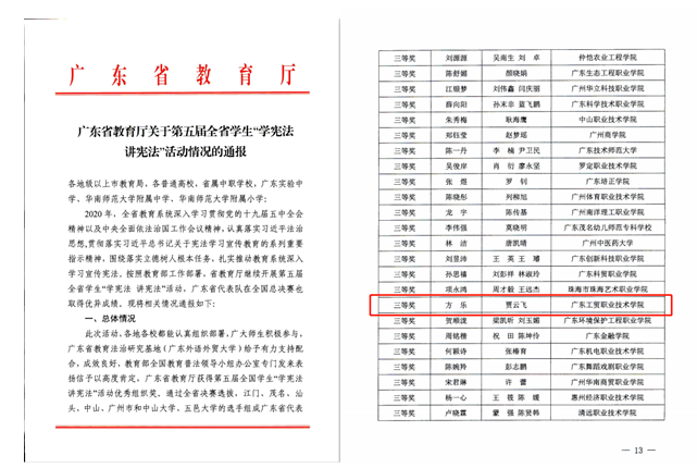 近日,由广东省教育厅主办的第五届全省学生“学宪法 讲宪法”活动圆满结束,新葡的京官网师生踊跃参与,马克思学院贾云飞老师指导、经贸学院19国际经济与贸易6班学生方乐完成的作品获得了三等奖。