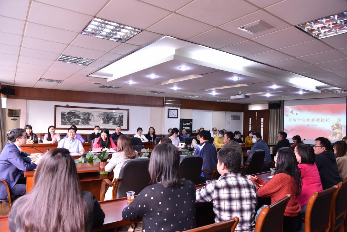 新学期伊始,为深入贯彻落实习近平新时代中国特色社会主义思想,全面落实全国和全省教育大会精神,进一步加强师德师风建设,提升学院教师的思想政治素质和职业道德水平,努力建设一支师德高尚、业务精湛、结构合理、充满活力的高素质专业化创新型教师队伍,经济贸易学院于2月28日下午在天河校区中心会议室举办了闻韶工程之新学期师德第一课。“第一课”由学院党总支书记李繁开讲,全体教职工参加。