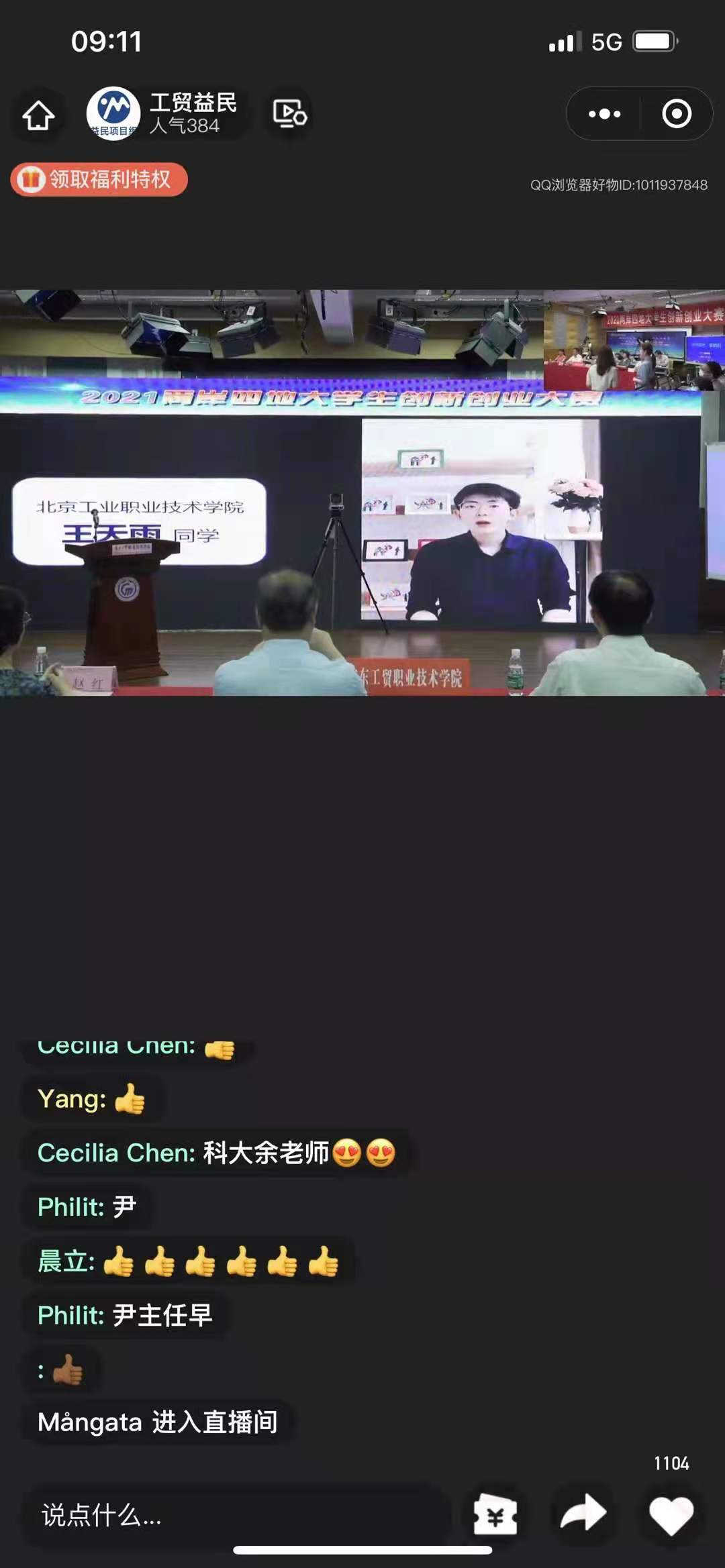 “希望疫情结束后,我们能正在聚首一堂,再话青创梦想!”北京工业职业技术学院王天雨同学通过视频连线,感谢主办方让选手们有了齐聚一堂的机会,选手更要公平竞技、赛出风格和水平。
