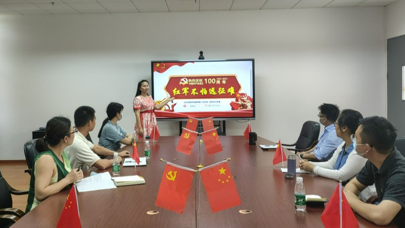 首先,龚云书记组织大家学习《实现中华民族伟大复兴是百年党史的线索和主题》,龚书记声情并茂的讲解让全体党员再次重温了党史,从1921年中共一大的召开宣告了中国共产党的成立至今,中国共产党带领中国人民跨过了一道又一道沟坎,取得了一个又一个辉煌胜利。回望过往的奋斗路,每一名党员都心潮澎湃,充分认识到我党的一百年是矢志践行初心使命,是筚路蓝缕奠基立业,是创造辉煌开辟未来的一百年。接着,支部书记廖晓虹给大家也上了一堂别开生面的党课——《红军不怕长征难》。党课介绍了中国工农红军从1934年到1936年整整两年的时间辗转15个省市,经历了600多次重要战役战斗,渡过近百条江河,翻过40座高山险峰,爬雪山过草地两万五千里长征。这是红军用血肉之躯谱写的英雄史诗,是人类历史上的奇迹。坚定革命理想、顾全大局、不怕险阻,与人民患难与共的“长征精神”时至今日依然在鼓舞着每一位党员。