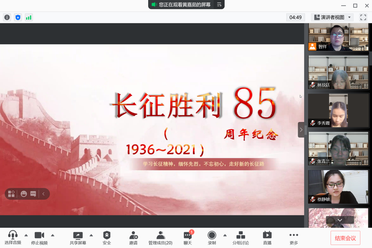 为利用暑假继续深入开展党史学习教育,做到暑假不停学,根据经贸学院党总支关于暑假党史学习教育的部署和要求,经贸教工陶智祥于8月14日在腾讯会议为学生第三党支部上了一门以《长征胜利85周年纪念》为主题的党课。