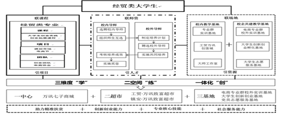 近年来,经贸学院以国家提出精准扶贫和乡村振兴战略为契机,依托广东工贸职业教育集团,经贸学院充分发挥“政校行企”资源优势,着力打造创新创业实践育人项目平台。在“互联网+”的背景下,通过“联课程、联师资、联场地,引项目、引人才、引资源,”将三维度“学”、二空间“练”、一体化“创”贯穿到以校企村联合共建的“一中心两超市三基地”为载体的实践教学过程中,达到人才培养质量不断提升和助力乡村振兴的目的。该项目以扶贫公益为主要性质、“消费扶贫”和“以购代捐”为理念、“工业产品下乡、农产业上行”为行径、平台线上与实体店线下相结合运营的特色扶贫电商,平台运营至今总消费额逾百万,助力镇安村精准扶贫脱贫攻坚,入选了广东省大中小学德育成果展示,是广东省十佳网络公益项目。