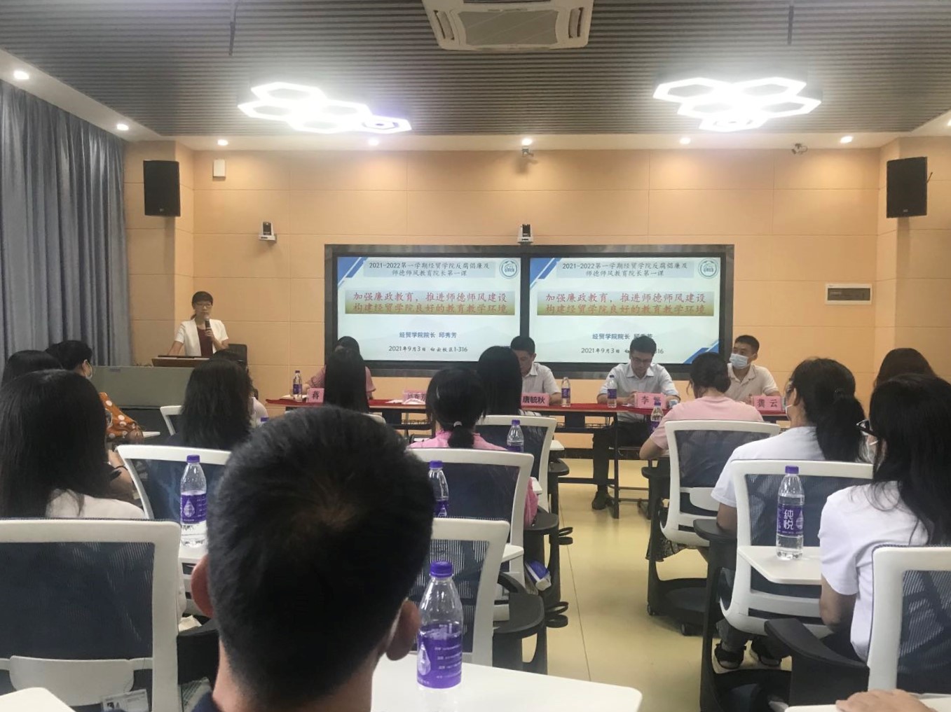 2021年9月3日新学期开学伊始,经贸学院院长邱秀芳为学院全体教师开讲“师德第一课”。