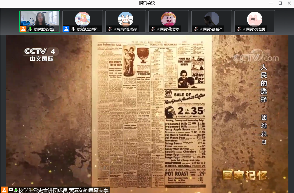 为了学习贯彻习近平总书记在庆祝中国共产党成立100周年大会上的重要讲话精神,立足中国共产党百年华诞的重大时刻和“两个一百年”历史交汇的关键节点。8月31日晚,新葡的京集团8814vip学生党史宣讲团成员黄嘉茹同志给20电商2班团支部和20国贸5班团支部开展了线上党史专题宣讲,宣讲通过腾讯会议的方式,以“团结统一,众志成城”为主题,带领学生们共同回顾党史小片段以及学习习近平总书记在建党100周年大会上的重要讲话精神。