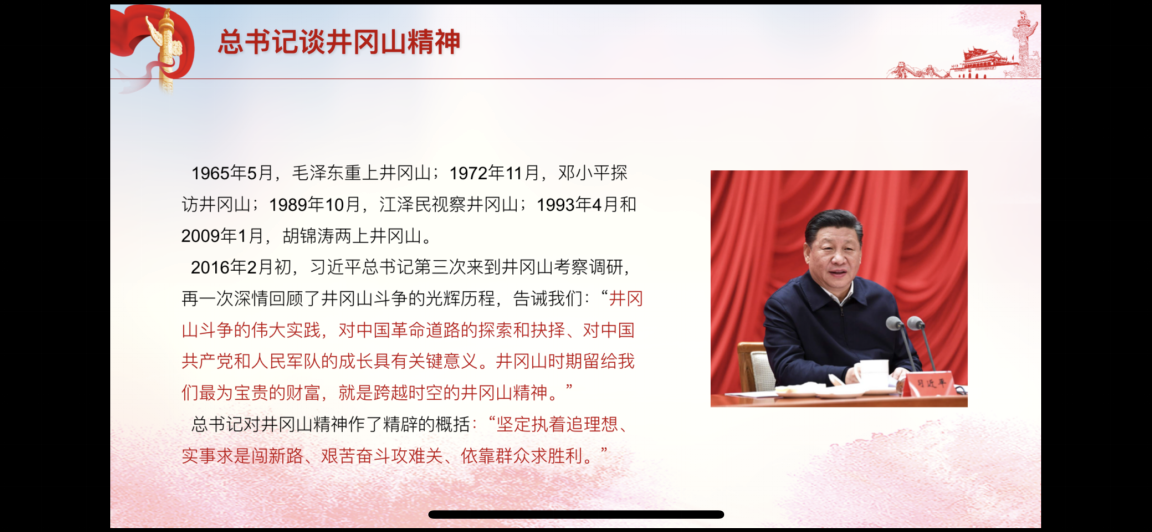 通过本次党课的学习,同学们学有所思、学有所得、学有所悟,学史明理、学史力行。在学习了井冈山精神后,同学们纷纷表示,要继续学习和了解党史,将不断加强个人政治修为作为终身的追求;要把学习的成果转化为自身学习、工作的实际行动,努力做到脑子清、身子勤、心灵静、手脚净,写好人生答卷,谱写好事业篇章,为祖国的繁荣发展添砖加瓦。