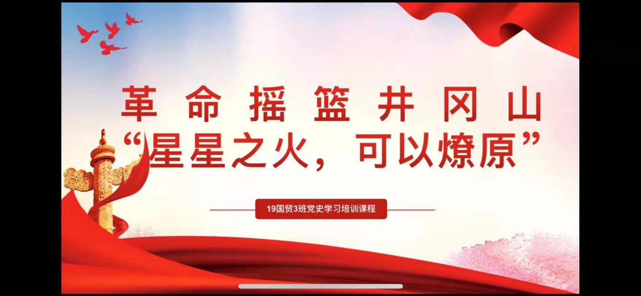 建党百年,悠悠岁月穿越承载了荣光与热血的时空。在新时代,井冈山精神放射出新的时代光芒。为了学生能够更好的学习党史了解井冈山精神,按照经贸学院党总支暑期党史学习安排,经贸教师党员刘佳珺线上为19国贸3班上了一次题为“革命摇篮井冈山‘星星之火,可以燎原’”的党课。