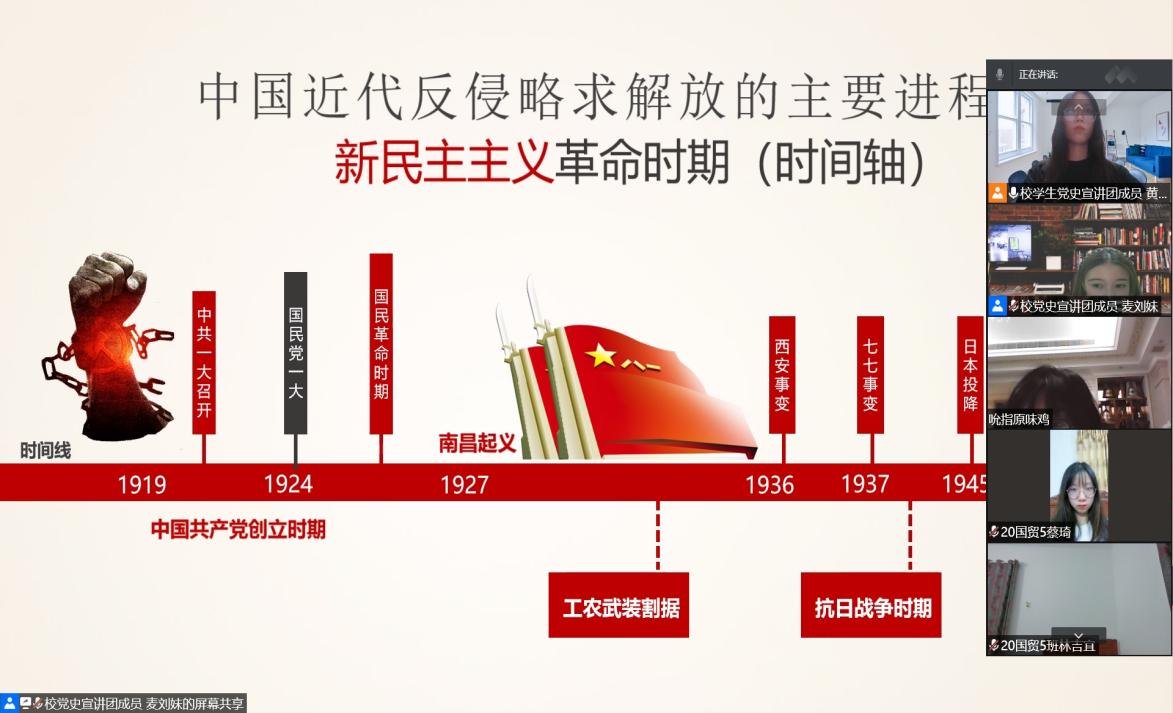 9月3日晚,校学生党史宣讲团成员19国贸5班麦刘妹同学向20国贸5班团支部和20电商2班团支部开展党史线上宣讲活动,带领学生们学习习近平总书记在建党100周年大会上的重要讲话精神及新民主主义时期的奋斗精神。