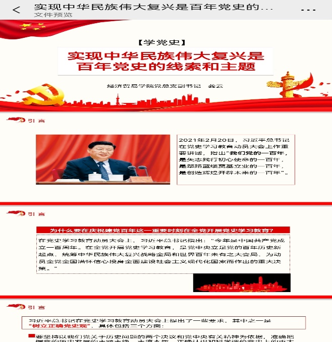 2021年7月29日下午,为了庆祝党成立100周年,深入推进党史学习教育,传承红色基因,按照学院党总支的统一安排,经贸学院教师第一党支部龚云老师给20电商1班全体同学上了一堂生动的党史学习课,回顾百年党史。