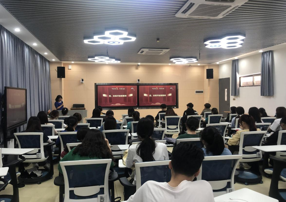 课上,邓彩云老师分别从红船启航劈波行、峥嵘岁月竞风流、拨乱反正止浩劫四、改革开放报春来、百年芳华恰少年五个方面详细的回顾了中国共产党的发展历程。在讲授过程中,邓彩云老师重点介绍了中共一大的召开,中国前后经历了三次国内革命战争和长达八年的抗日战争。中国共产党走过万里长征,牺牲无数革命先烈,一路负重前行,在三十年的血雨腥风中一步一步走向光明和胜利,1978年,十一届三中全会吹来改革开放的春风,中国发生了翻天覆地的变化。在中国共产党的领导下,中国和中国人民在经历了一次次磨难后,如凤凰涅槃般在地球的东方熠熠生辉。