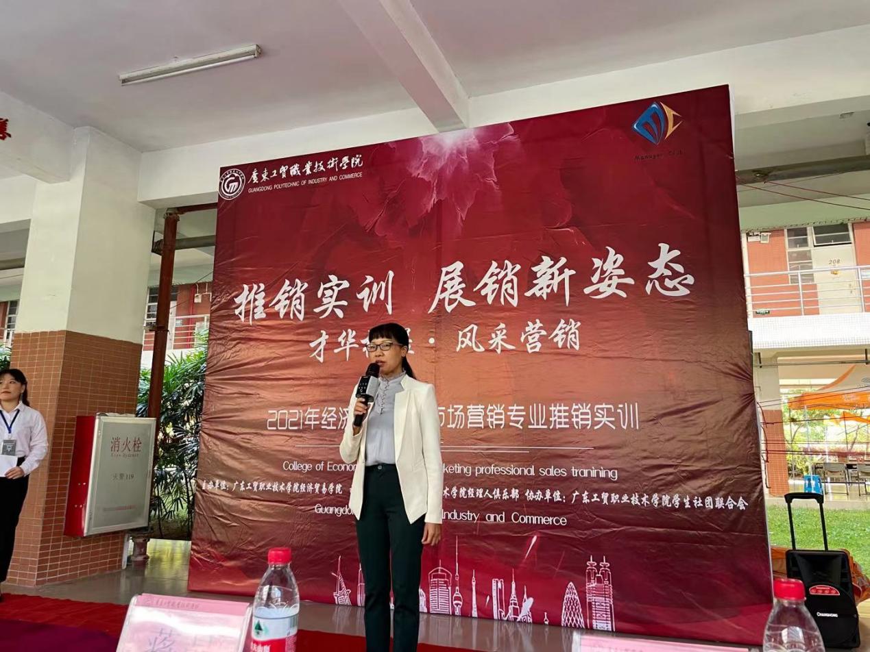 市场营销专业陈李珠同学代表全体参与实训的同学发言,表示将好好珍惜此次推销实训的机会,提升同学们自身的动手能力和团结协作能力。