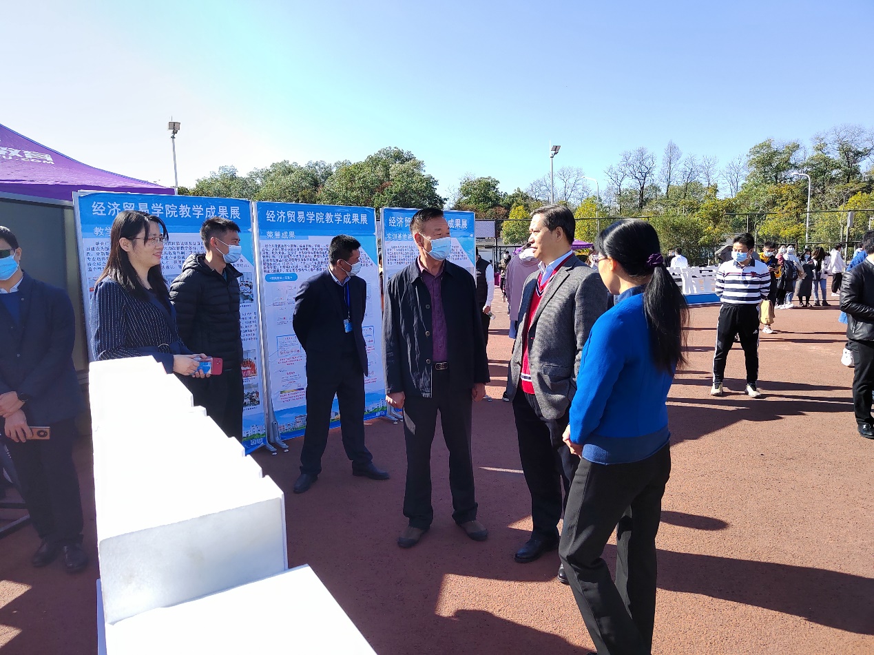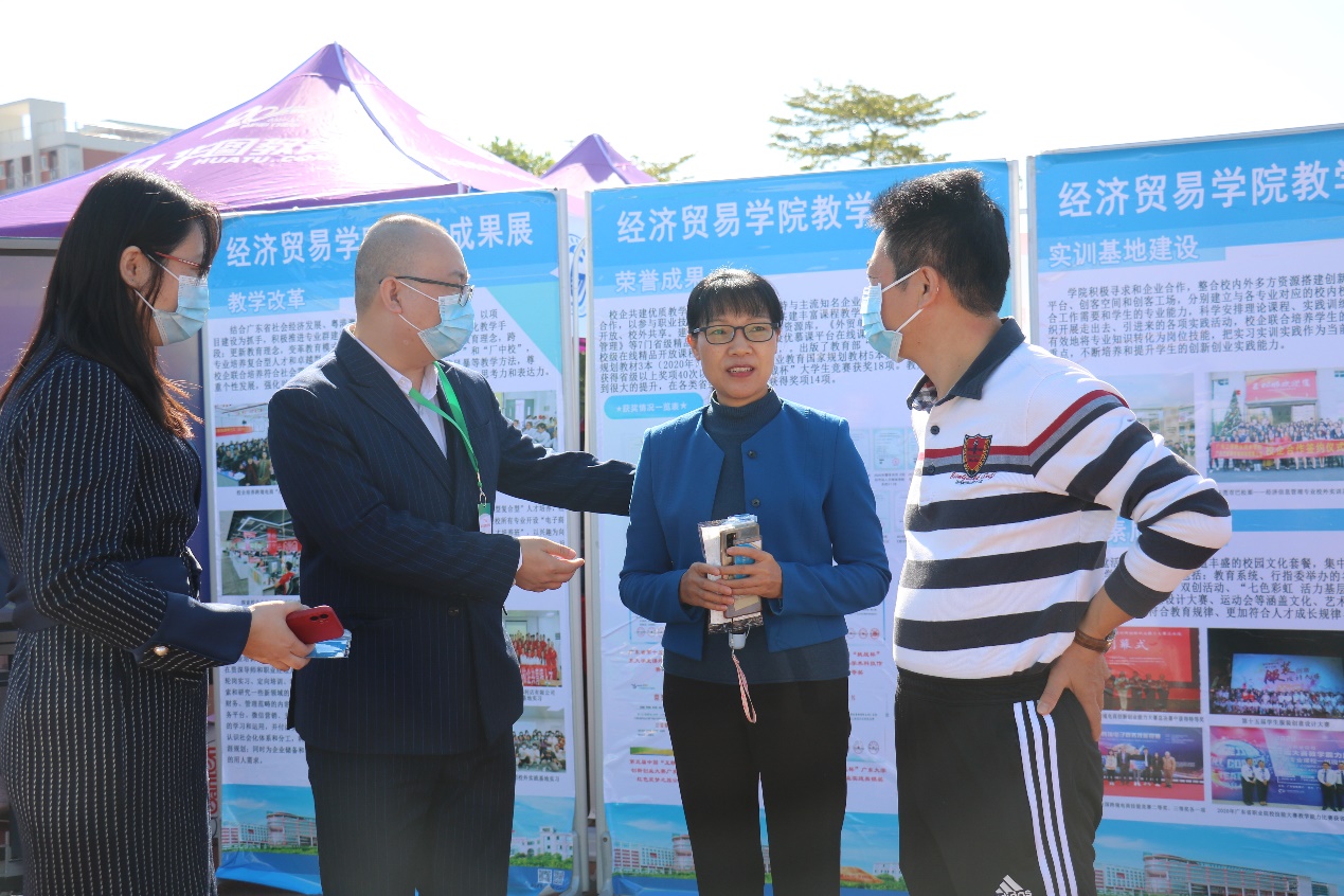 广东省高等学校毕业生就业促进会会长王玉学、省教育厅就业创业处副处长张昌应、科长孟秋贞、学校领导班子成员亲自莅临经济贸易学院教学成果展示区督察工作落实情况,学院院长邱秀芳围绕学院介绍与交流与合作、实训基地建设与学生素质成果、教学改革成果等方面向省领导、校领导进行汇报。
