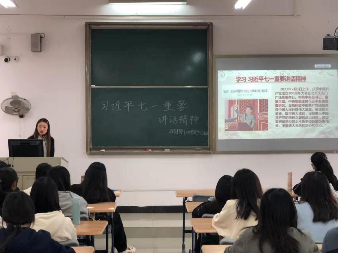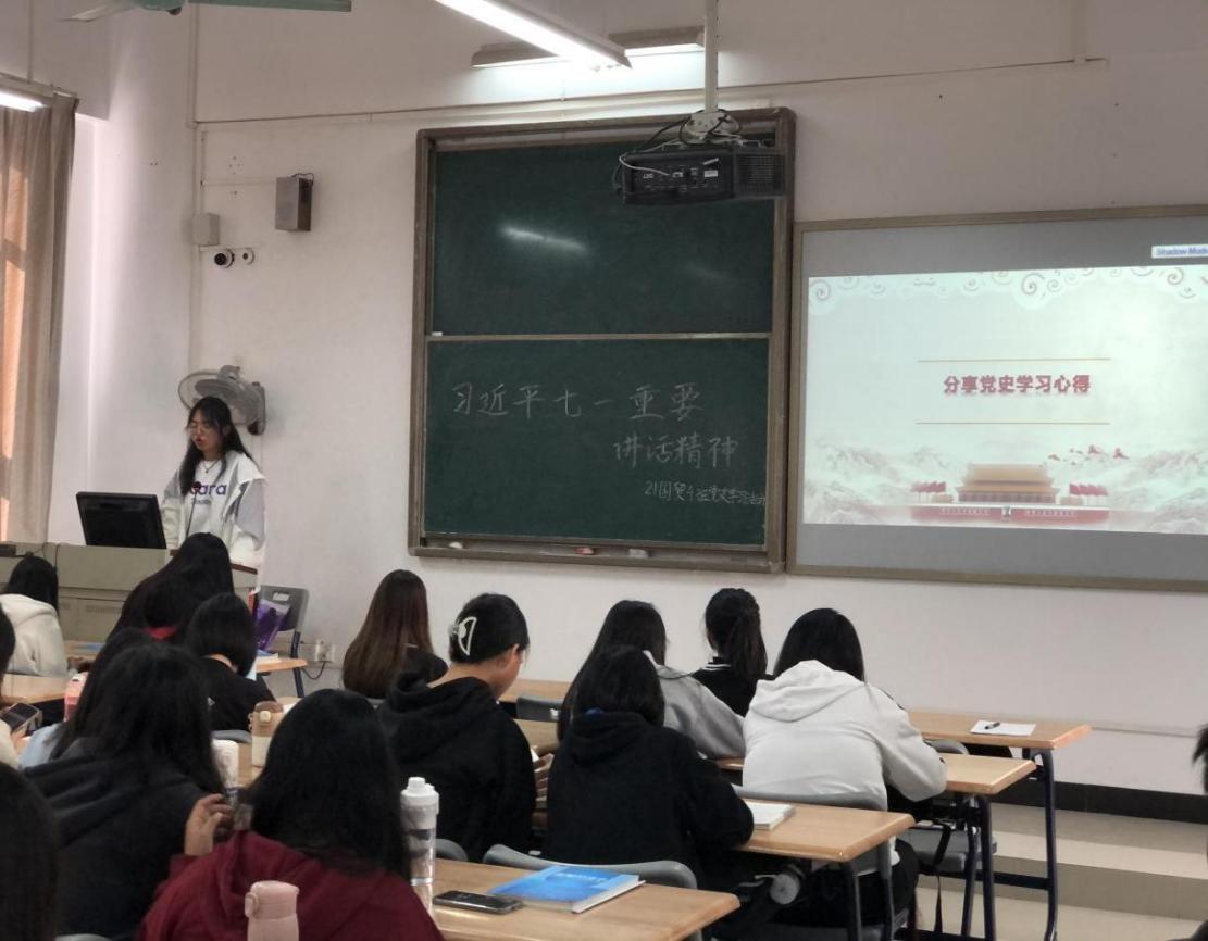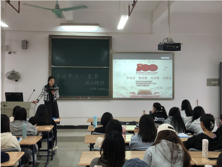 为深入贯彻落实习近平总书记在党史学习教育动员大会的重要讲话精神,按照学校2021级新生党史学习教育实施方案要求,12月16日下午,经济贸易学院学生第二党支部在新生21国贸4班开展党史学习教育,落实立德树人根本任务,引导新生厚植爱党爱国情怀,从百年党史中汲取奋进力量,做有志气、有骨气、有底气的新时代青年,会议由支部书记陈晓艳主持。