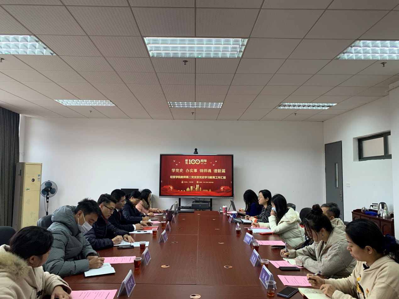 教师第二党支部支委李文婷汇报本支部开展党史学习教育的情况。李文婷支委分享了自党史学习教育启动以来,经贸学院教师第二党支部迅速响应、精心部署,积极行动,引导广大党员学好用好“党史”提升思想觉悟,努力在学深、悟透、做实上不断推进支部建设工作取得了一定成效的情况。李文婷支委还表示虽然本年度即将结束,我们将进一步丰富党史学习形式,拓展党史教育的深度和广度,自上而下形成“党史”党课的学习氛围,真正让党史学习教育入脑入心,争取更大的进步。