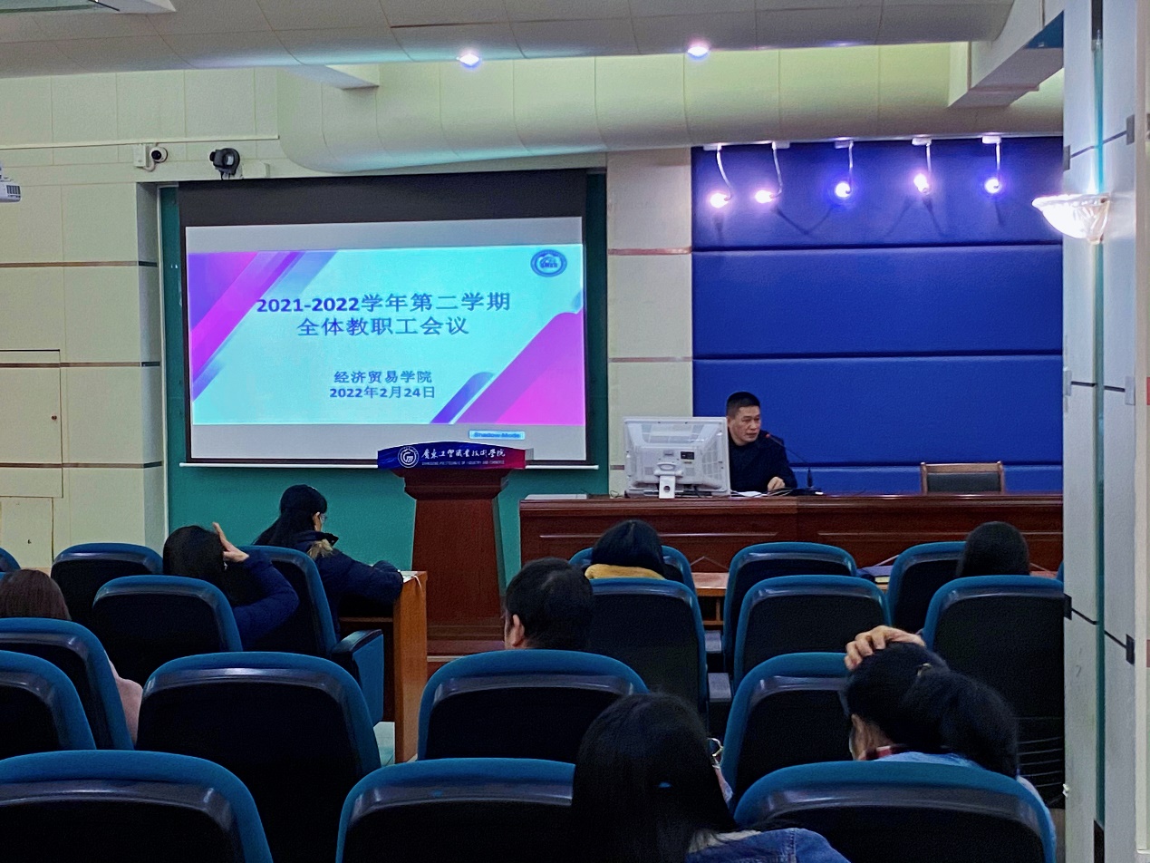 假期悄然过去,新学期如约而至,为确保新学期各项工作有序开展,2月24日下午,经济贸易学院2021-2022学年第二学期全体教职工大会在天河校区西区五楼报告厅召开。学校党委委员、副校长唐毓秋,经贸学院班子成员李繁、邱秀芳、龚云、蒋晶及全体教职工参加会议。会议由经贸学院党总支书记李繁主持。