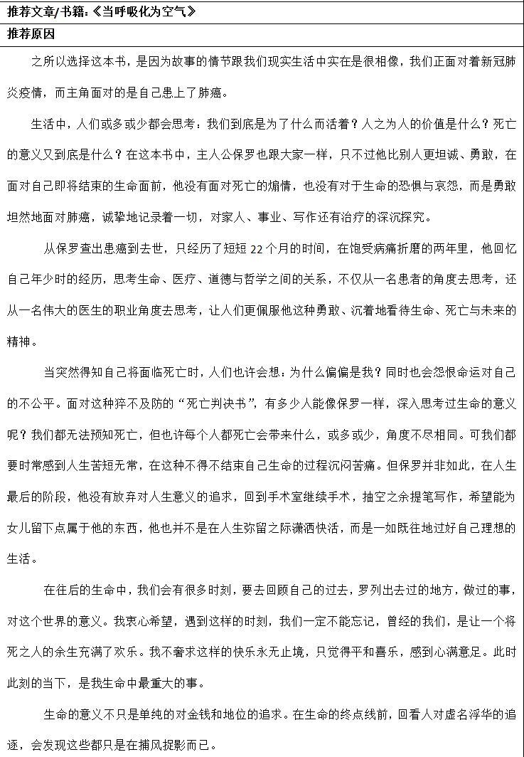 二等奖:20国贸6班张李妹《敬畏生命,亦不畏惧时光以生命,生命以时光生命的意义在于不断折腾》;21国贸6班陈砚《为每一朵花驻足、伴每一缕风起舞,使得平凡日子也闪着独有的光彩,我愿用纤弱的手紧抓生命的芦苇》。