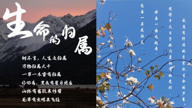 一等奖:20电商2班赵晓晴《树不言,人生之归属、万物归属大千、一树一木皆有归属、你切看,黑夜有星月照应、山林有畜牧来修剪、花草有虫蝶来飞往》。