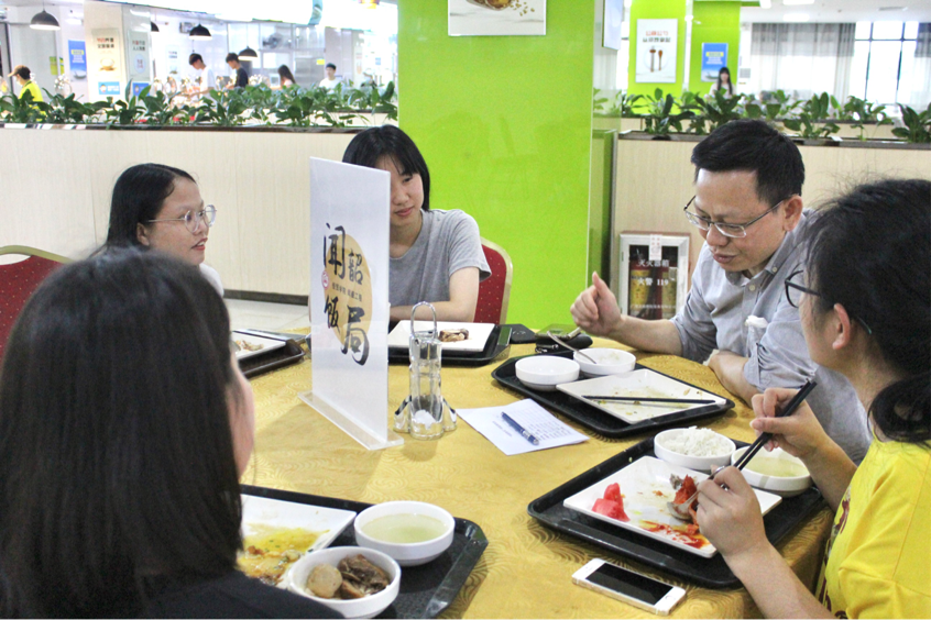 5月开始每天的午餐或者晚餐时间,师生之间亲切围坐在餐桌前、自由交流沟通。本次闻韶饭局中,经济贸易学院党总支书记李繁,院长邱秀芳,经贸学院党总支副书记龚云,副院长蒋晶带头参加,经贸学院全体教师与全体班级代表参与。