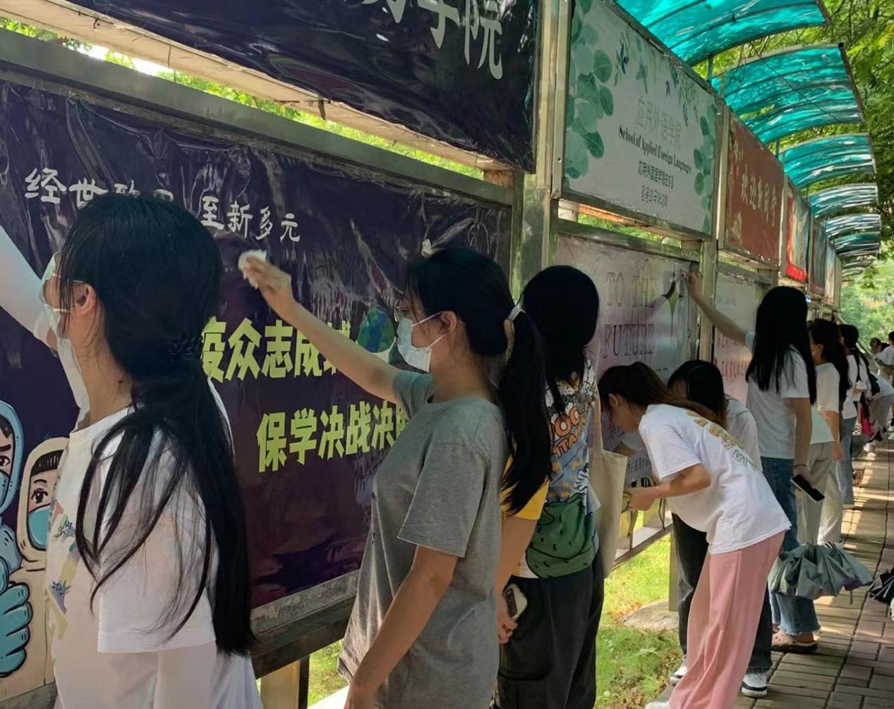 本次社会实践活动将学员分为四组,带上布对兰苑附近的15个宣传栏、明德楼1区2楼47个宣传栏、1区2-4楼楼梯间宣传栏、演艺厅马路旁的宣传栏和椅子进行擦拭清洁,为学校的老师同学们提供一个更加干净的校园环境。