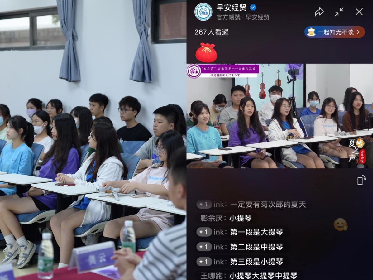 出席本次活动的领导、嘉宾和老师有:学校党委委员、副校长刘贻新,经贸学院院长邱秀芳,党总支副书记龚云,经贸学院副院长蒋晶,经贸学院办公室主任邓彩云,室内乐组合(GZ Pro ARTE)演奏老师誉昊、施凌坤、梁应标,经贸学院班主任甘朝阳、杨婷婷、李文婷、徐萌、潘嘉琪、陈靖云,特邀辅导员黄小奇、章少重、陶智祥、吴海英。本次活动由李文婷主持,通过直播平台(“早安经贸”视频号)线上线下同步进行。