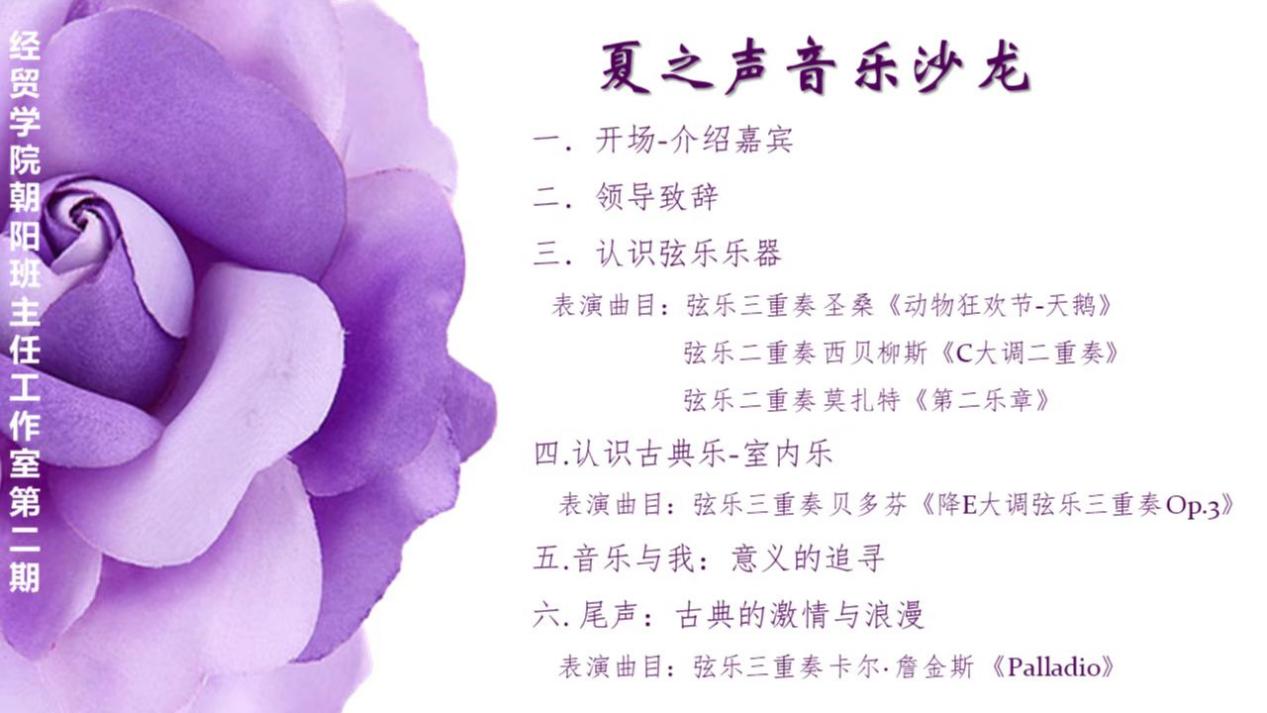 蝉鸣蛙声,淅沥雨滴,飞鸟婉啭。为进一步丰富新葡的京官网校园文化活动,展现大学生积极向上的精神面貌,培养和提高师生文化品位和艺术修养,倡导健康高雅艺术进校园,引领青年学生做先进文化的倡导者和实践者,在学校领导和经贸学院的大力支持下,朝阳班主任工作室于6月9日下午14:45,在明德楼1-316智慧课室举办了一场题为“夏之声”的音乐沙龙主题活动,活动邀请了广州普艺室内乐组合(GZ Pro ARTE),为广大师生带来了一场古典音乐的视听盛宴。