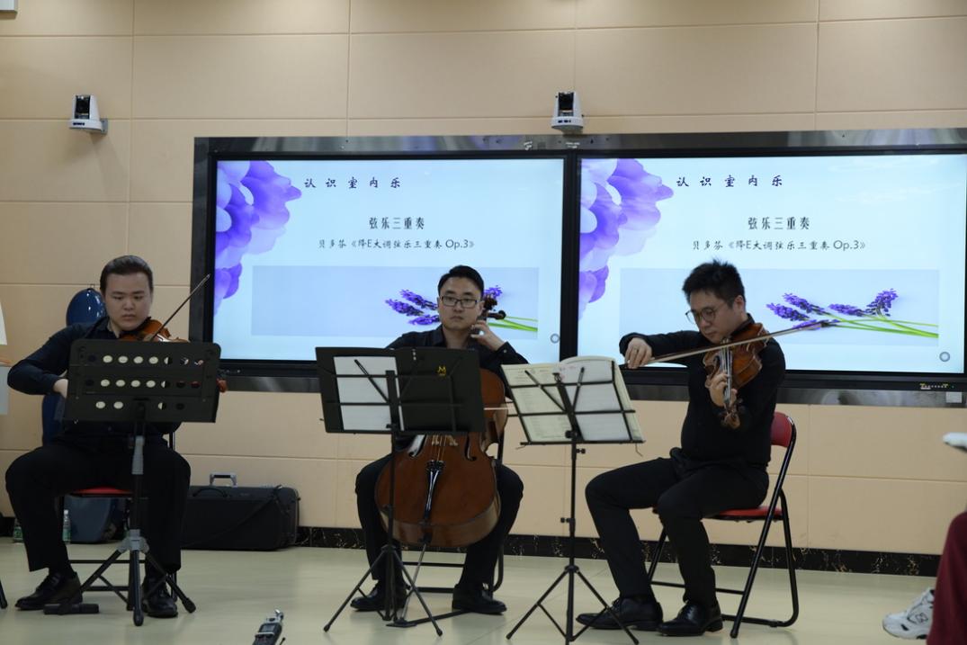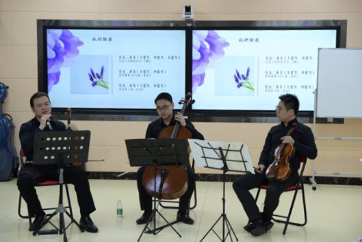 李文婷带领着线上线下的小伙伴们,一起听了来自乐器发出的声音,在大家的迷惑中,李文婷请出了我们的普艺室内乐的三位演奏家为线上线下观看的同学们一一解答,给大家带来了一场不一样的乐器课堂。带大家认识大提琴、中提琴、小提琴的音色差别和弦乐重奏的基本知识,他们还带来了弦乐三重奏 圣桑《动物狂欢节—天鹅》、弦乐二重奏 西贝柳斯《C大调二重奏》、弦乐二重奏 莫扎特《第二乐章》,一场震撼的视听盛宴。