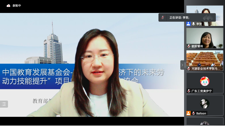 为进一步贯彻落实习近平总书记关于职业教育的重要论述精神和全国职业教育大会精神,落实《教育信息化2.0行动计划》,深入推进中央电化教育馆《关于开展2021-2022年度中国教育发展基金会-戴尔“数字经济下的未来劳动力技能提升”项目交流与总结工作的通知》文件要求,6月15日,广东省戴尔项目在线交流会在腾讯会议顺利召开,中央电化教育馆职业教育教学资源部副主任李贺、广东省电化教育馆发展研究部欧阳慧玲主任、李红霞老师、新葡的京官网经济贸易学院黄伊宁老师及其余14所参训院校负责人参与了本次会议。