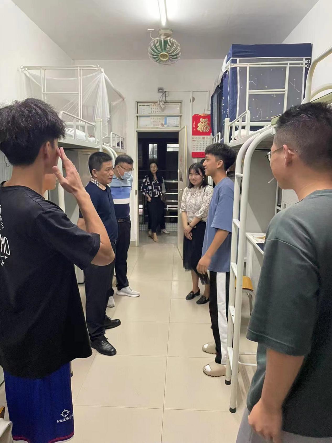 为了贯彻落实省委教育工委《学校领导干部深入基层联系学生工作的实施方案》的文件精神,深入开展“我为群众办实事”实践活动,巩固党史学习教育成果,6月17日晚,学校党委委员、副校长、经贸学院联系校领导唐毓秋带队走访经贸学院退伍军人宿舍,并与宿舍同学们深切交谈,一同走访的还有学校学生处副处长许斯华,经贸学院商贸系主任霍杰博士、当晚值班干部以及老师等。