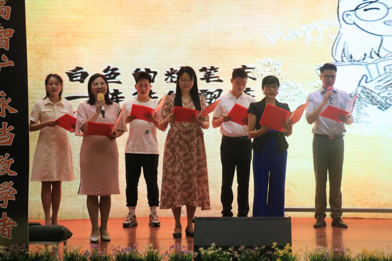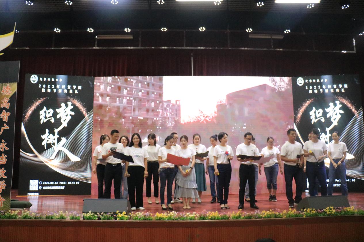 “有一群人,一面黑板三尺讲台,着一身素装,捧一颗心来,他们用知识丰盈学生的内心,用行为教他们做人的道理。这就是老师!他们坚守教育初心,立德树人,源于热爱可抵长路漫漫。”典礼上,由学院行政教师李繁、邱秀芳、龚云、蒋晶、邓彩云、黄小奇、陈晓艳、张志敏及学生黎晓丰等为大家带来诗歌朗诵《长路》。
