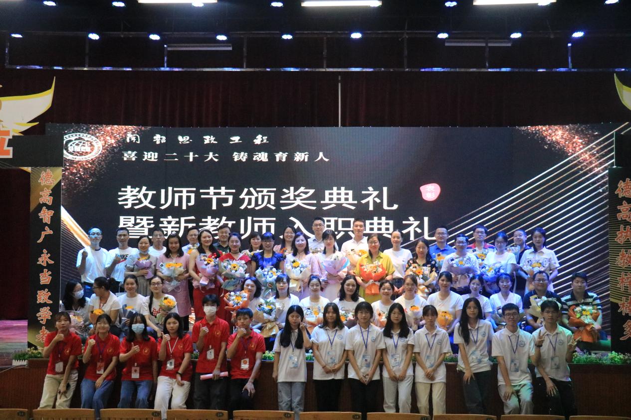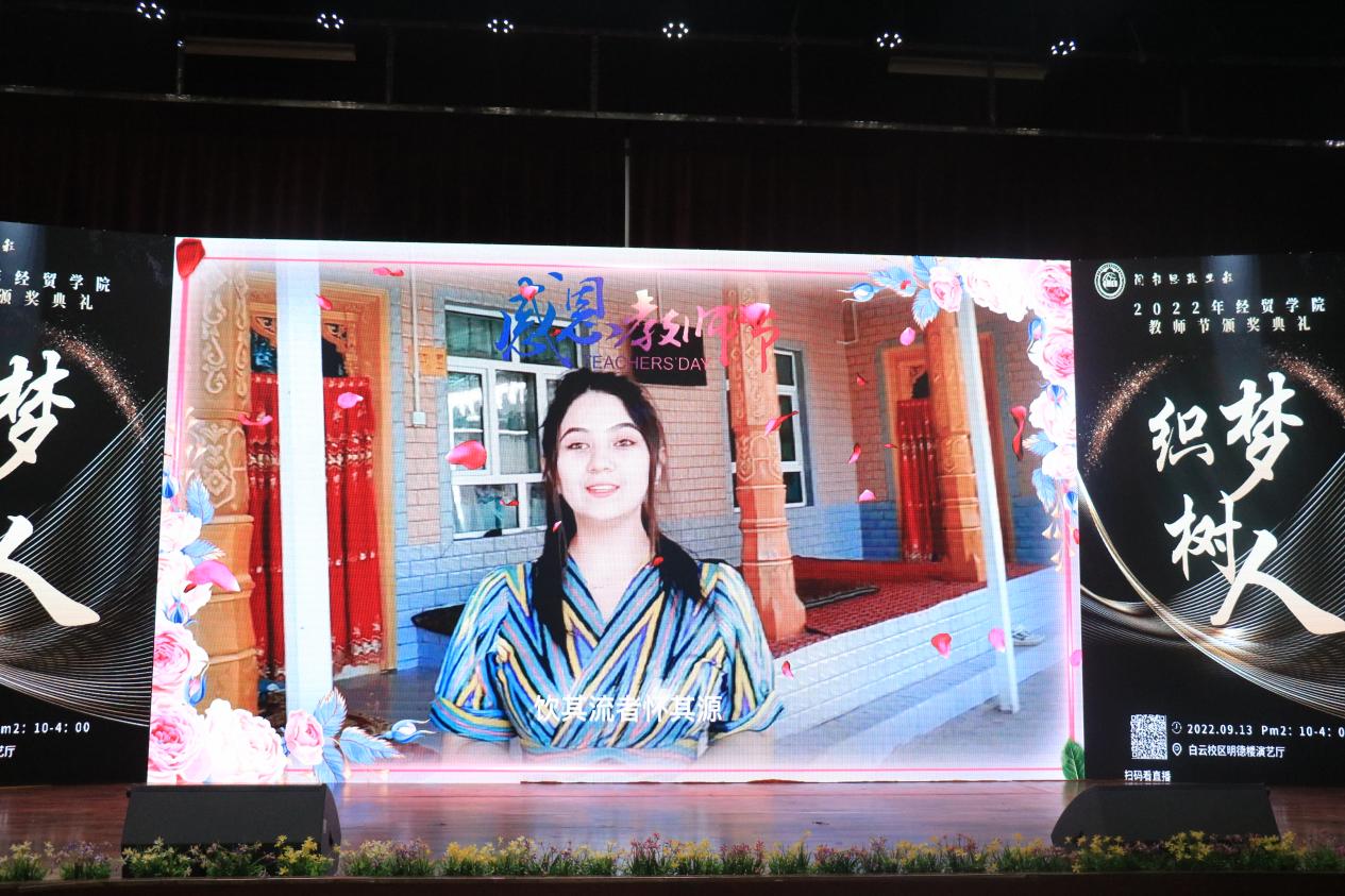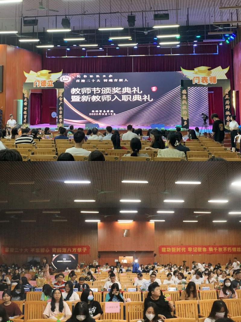 “人逢喜事精神爽,月到中秋分外明。”今年9月10日是我国第三十八个教师节,同时也是中秋节。在这美好的金秋时节,伴着收获的喜悦,为庆祝教师节,表彰先进,欢迎新入职的老师,经济贸易学院于9月13日下午14:00在白云校区105演播厅举行了一场盛大而又隆重的教师节颁奖典礼暨新教师入职典礼。典礼由经贸学院教师刘佳珺主持。本次典礼主题为:“喜迎二十大,铸魂育新人”,采用线上+线下相结合的模式,通过微信视频号平台对本次典礼进行全程实时直播。
