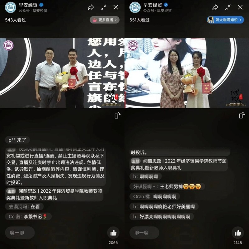 线下参加本次典礼的不仅有多位领导,还有全体经贸学院教职工及部分学生代表,现场观众超过200人。活动不仅线下举办,同时还线上平台全程三个机位同步直播,吸引了近1000人次在线观看,弹幕留言超过1500条,“我爱您陶老师”,“超哥您是最棒的”“想念工贸”“好久不见”……掀起了一波校友们的“回忆杀”。