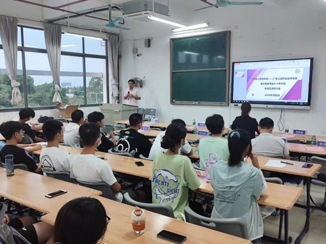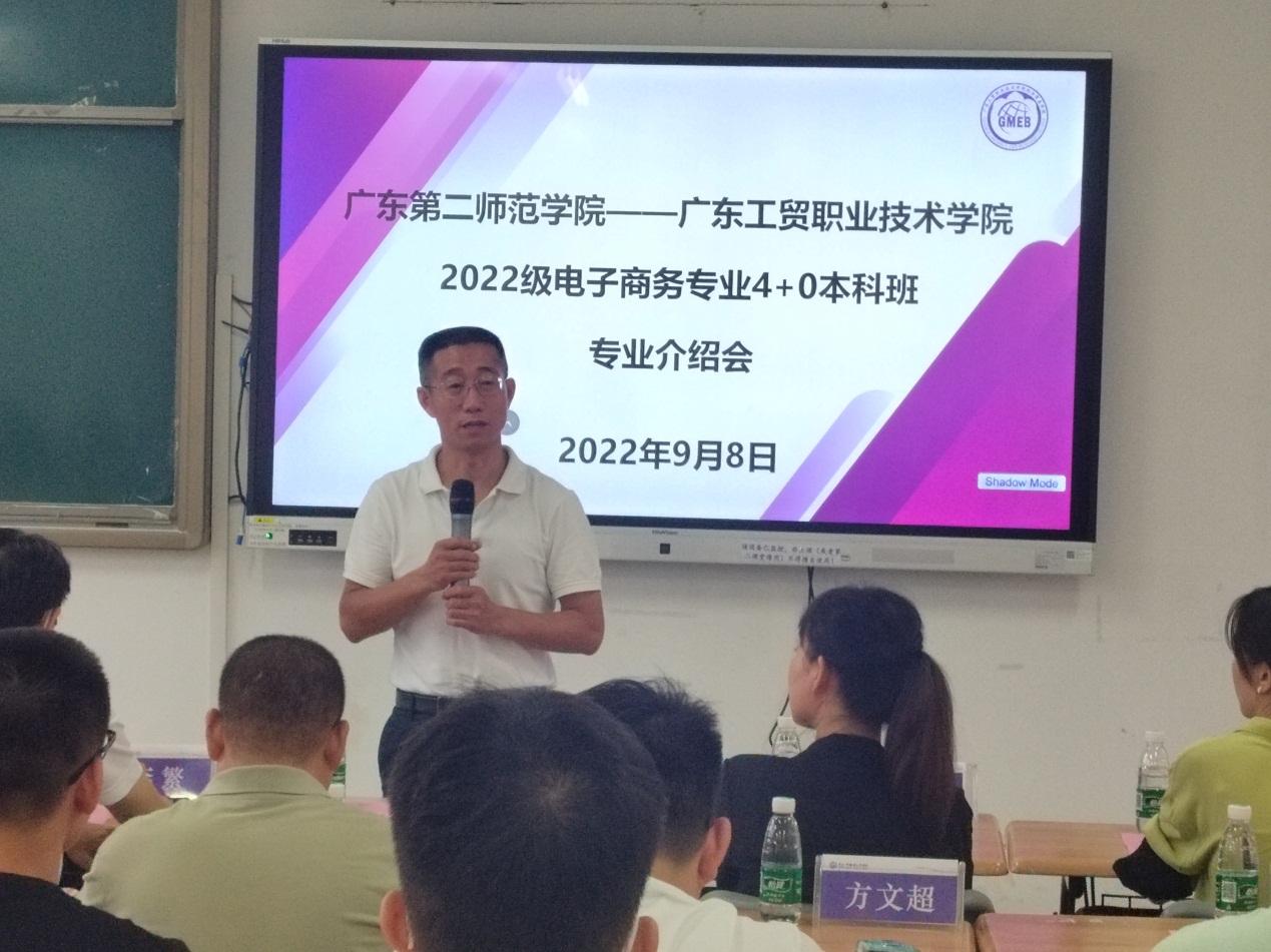 9月8日下午,广东第二师范学院-新葡的京集团8814vip2022级电子商务专业4+0本科班新生专业介绍会在白云校区明德楼1-405隆重举行。广东第二师范学院管理学院副院长梅晓仁、电子商务专业系主任孙楚、教师代表李胜蓉,新葡的京集团8814vip经济贸易学院党总支书记李繁,党总支副书记、院长邱秀芳,党总支副书记龚云,副院长蒋晶,商贸系副主任谷少永,电子商务专业带头人方文超,电子商务专任教师伍炜勤及22级本科班学生参加专业介绍会议。会议由方文超主持。