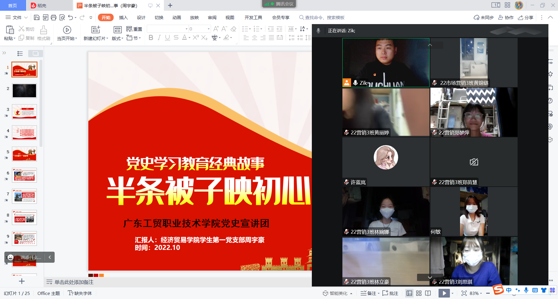 为深入开展党史学习教育,坚定不移引领青年学生学党史、悟思想、办实事、开新局,推动党史学习教育推深走实,10月17日,校团委党史宣讲团成员、经贸学院学生第一党支部学生党员周宇豪在腾讯会议上给22营销3班宣讲“半条被子”的党史故事,党史宣讲团的学习将会覆盖22营销专业所有班级。