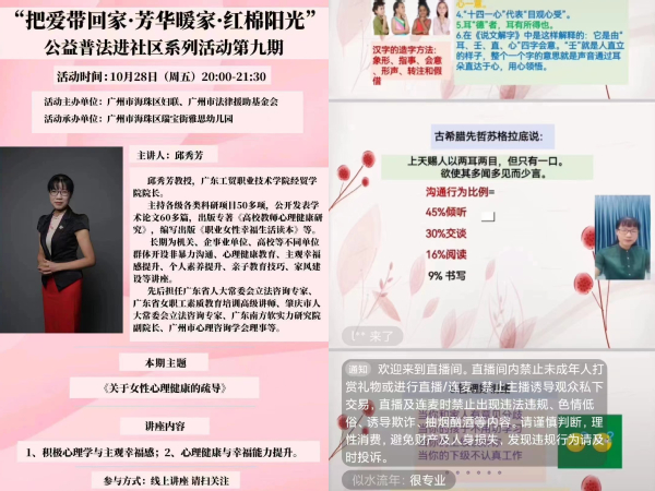 10月28日,为深入学习宣传贯彻落实党的二十大精神,工会小组成员、学院院长邱秀芳教授应邀参加了由广州市海珠区妇联、广州市法律援助基金会主办的“把爱带回家.芳华暖家.红棉阳光”公益普法进社区活动。