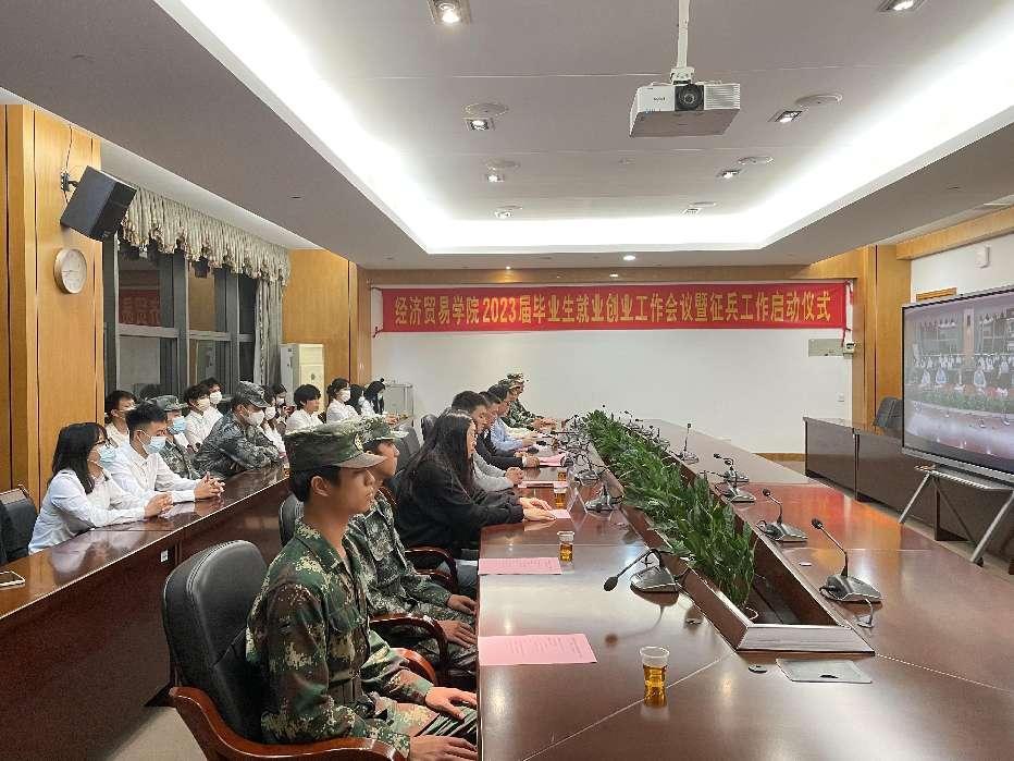 为学习宣传贯彻党的二十大精神,切实做好2023届毕业生就业及征兵工作,帮助毕业生了解就业形势及政策,激发毕业生的参军热情,提高毕业生综合竞争力,11月24日晚上,经济贸易学院在明德楼中心会议室通过线上与线下相结合的方式,组织召开了2023届毕业生就业创业工作会议暨征兵工作动员大会。学校党委委员、副校长唐毓秋,经贸学院党总支书记李繁、学院院长邱秀芳、党总支副书记龚云、学院副院长蒋晶,学院全体辅导员、毕业班班主任及2023届全体毕业生参加了本次会议。会议由李繁主持。